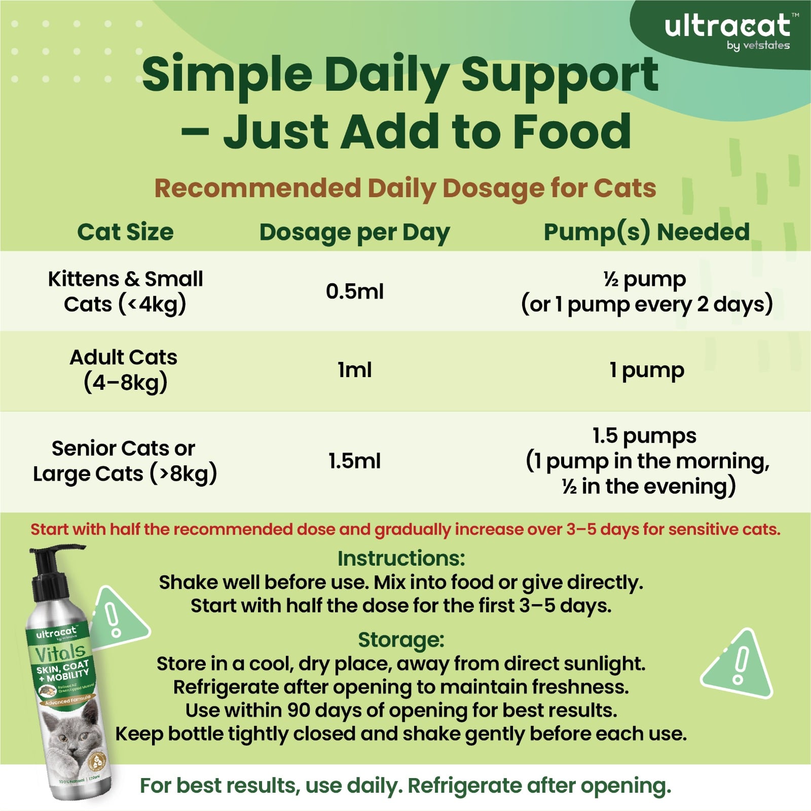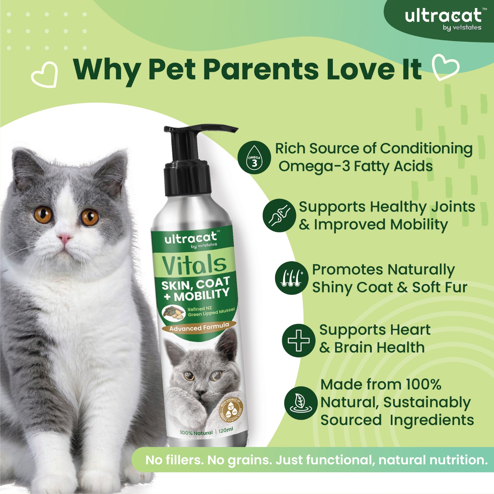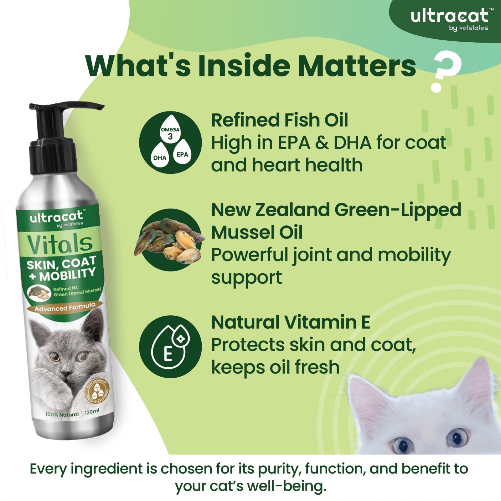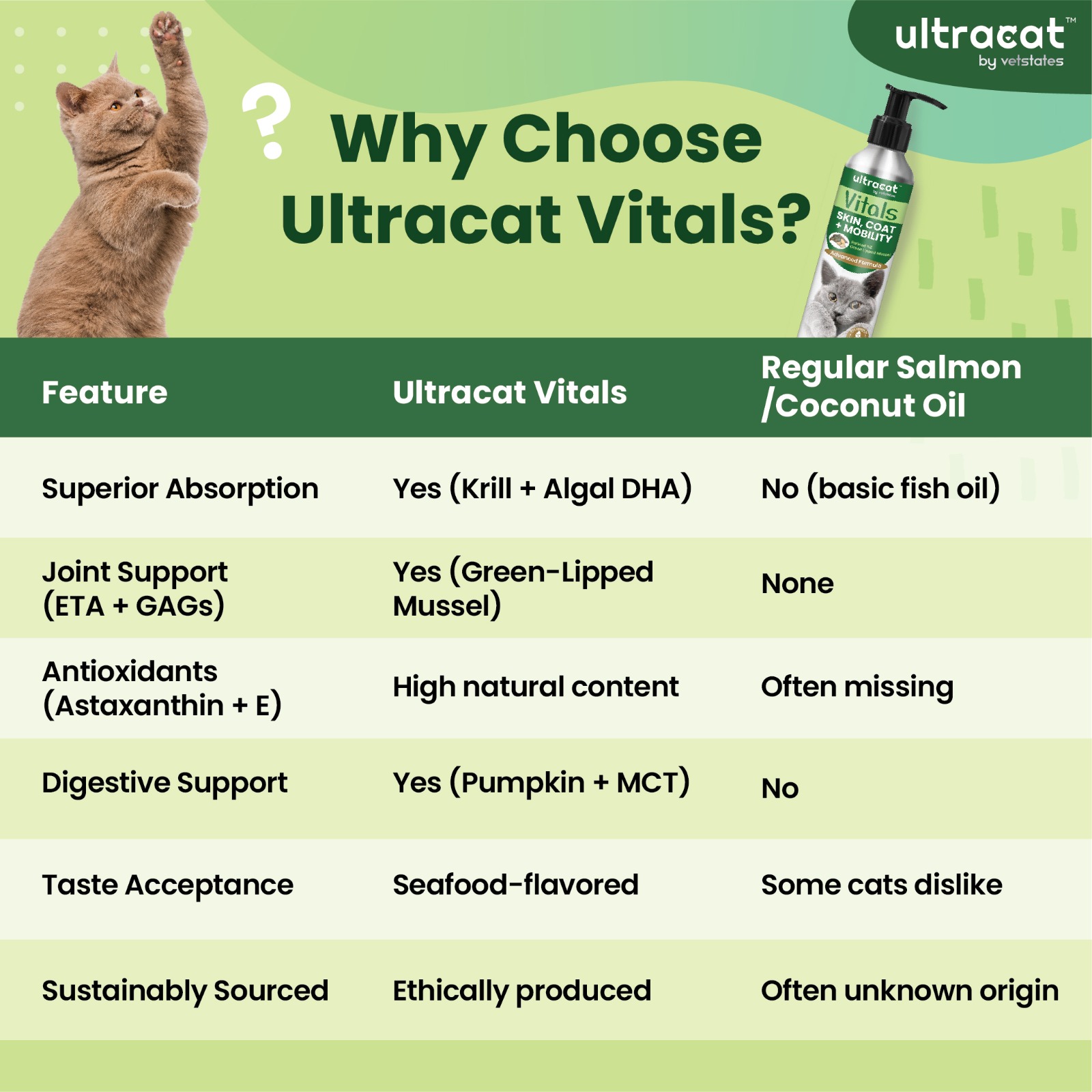 UltraCat Vitals combines Green-Lipped Mussel, Krill Oil, Algal DHA, and 7 functional oils in one premium formula. Developed for picky, aging, or sensitive cats needing extra care for joints, coat, digestion, and energy.