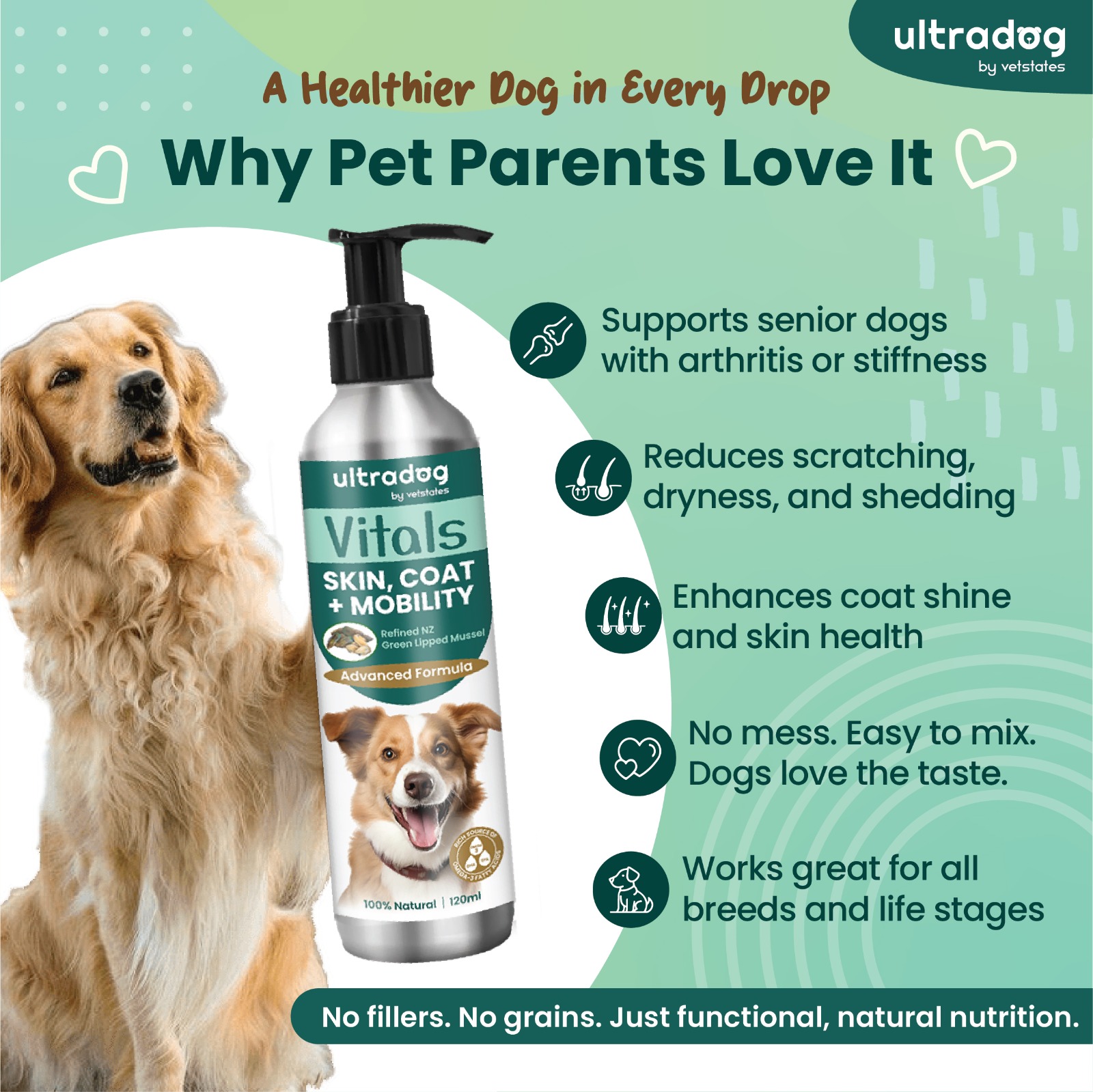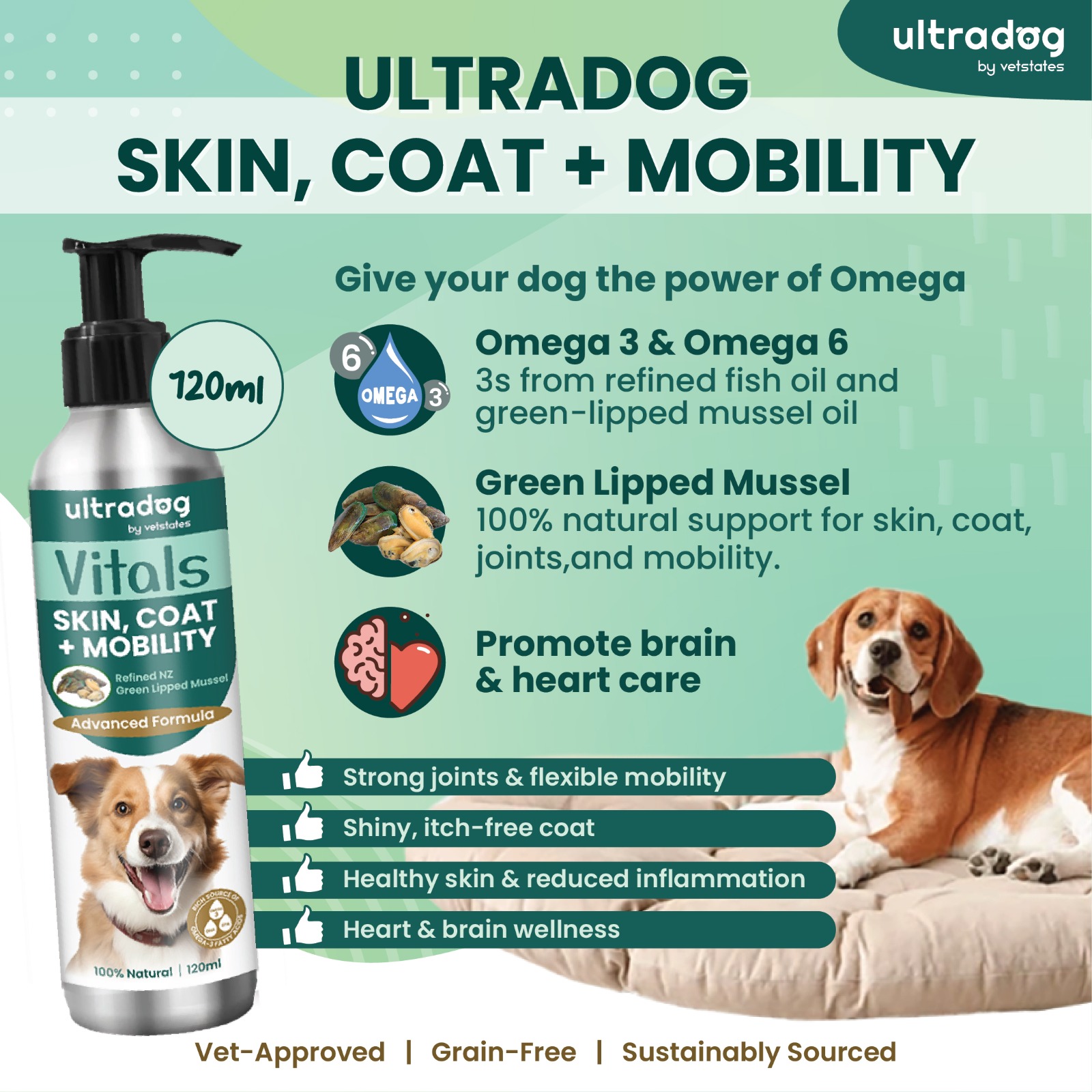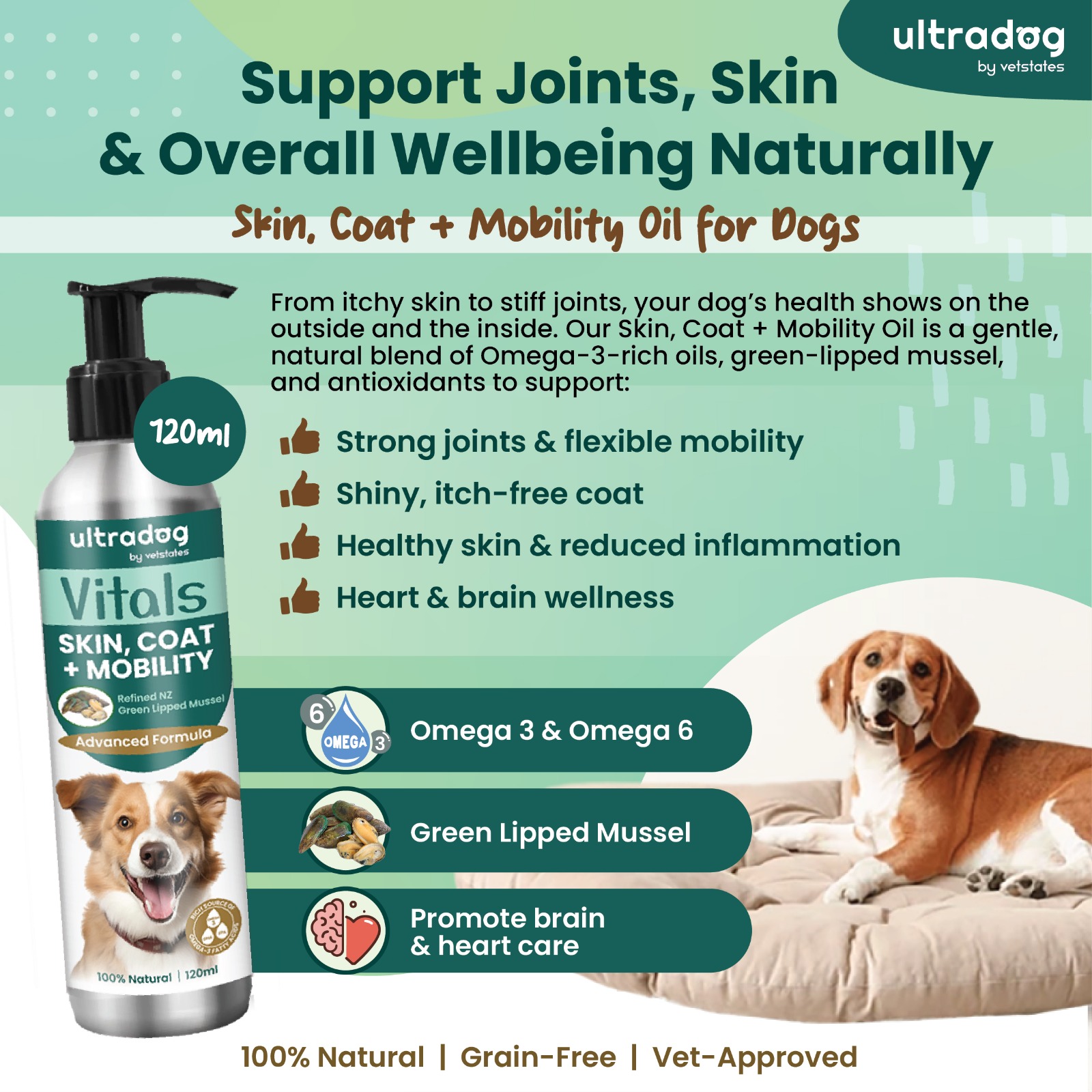 UltraDog Skin, Coat + Mobility is more than just a fish oil — it’s a multi-functional wellness oil combining high-quality omega-3s, joint-supporting mussel extract, and anti-inflammatory botanicals to deliver real results you can see and feel.