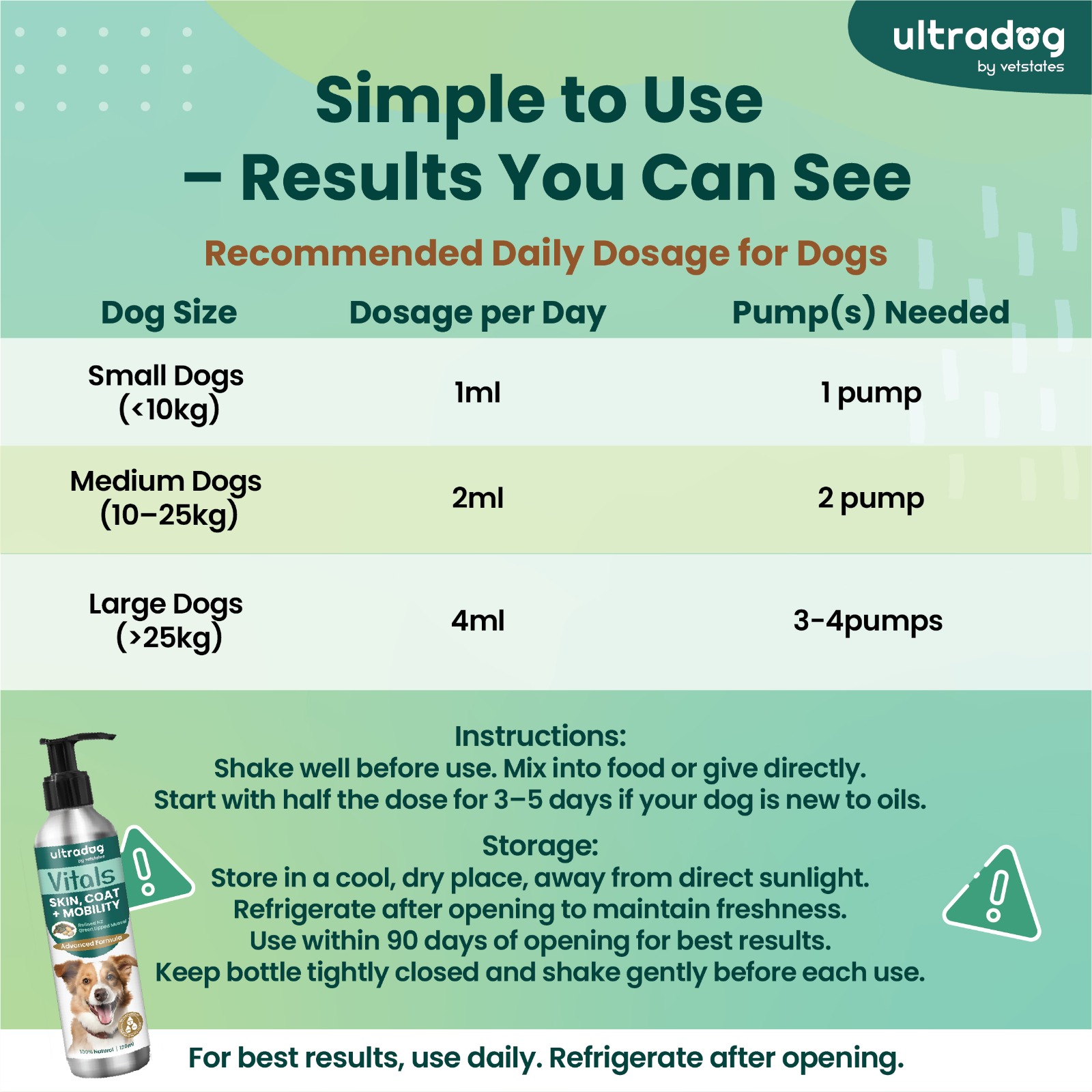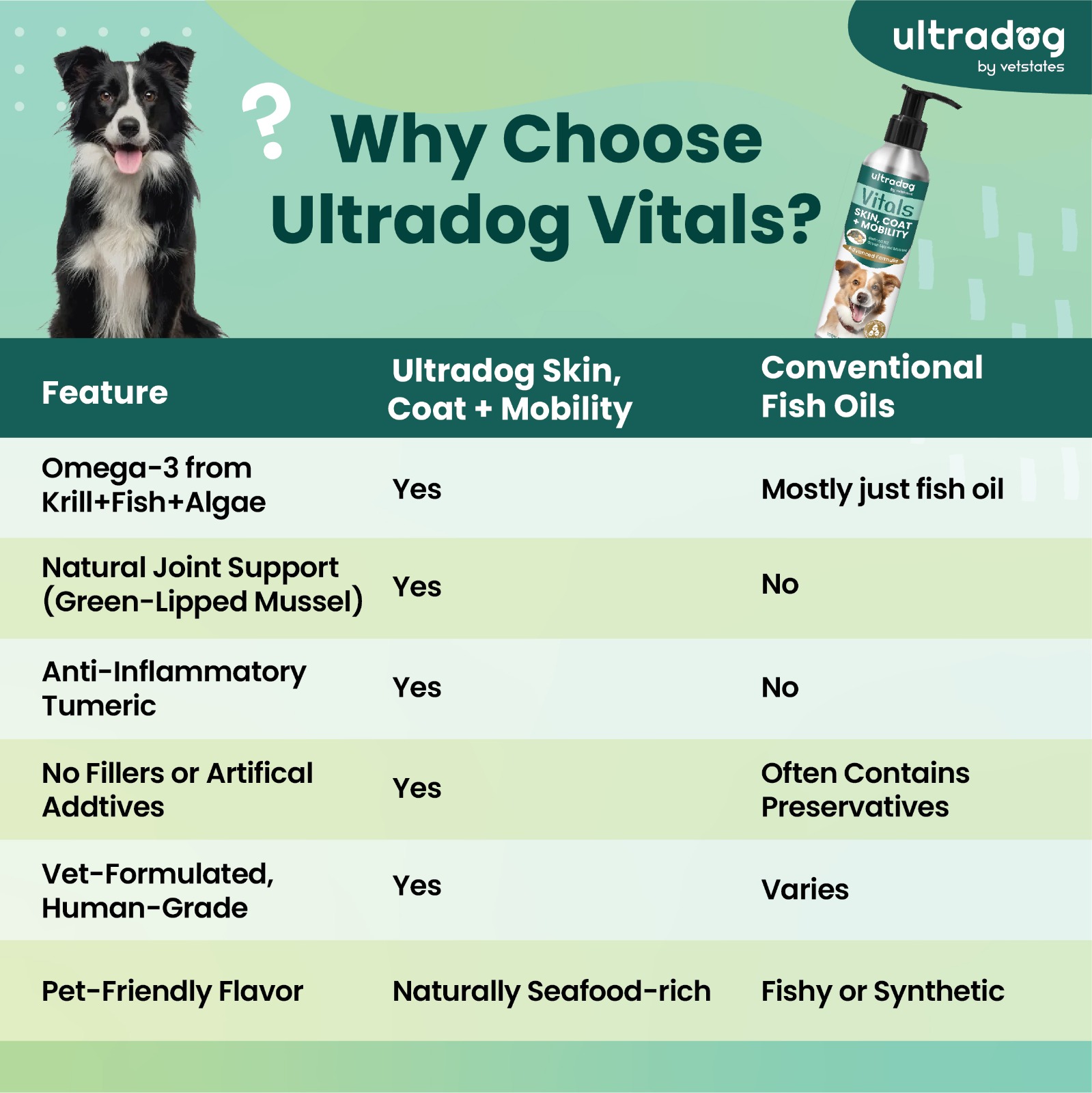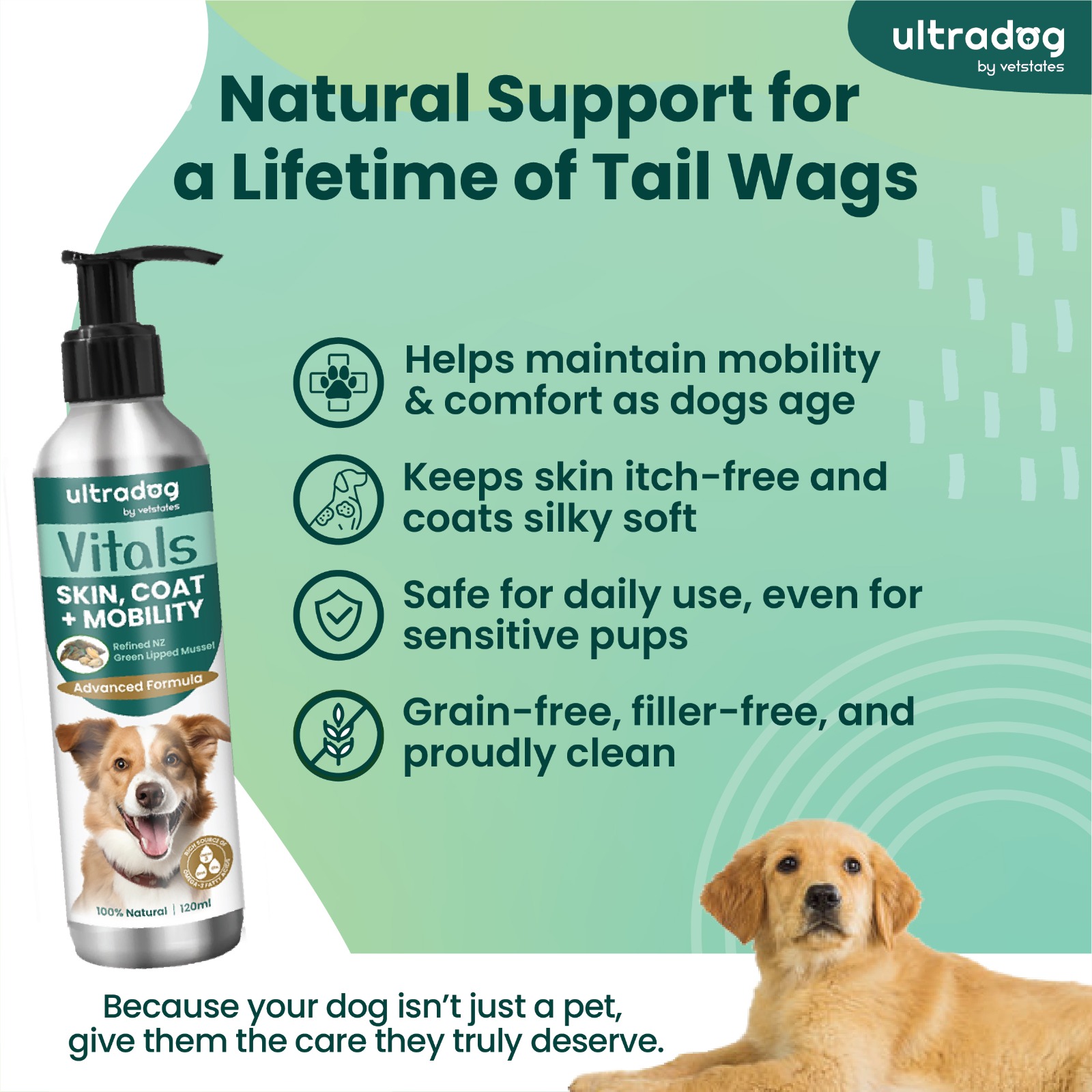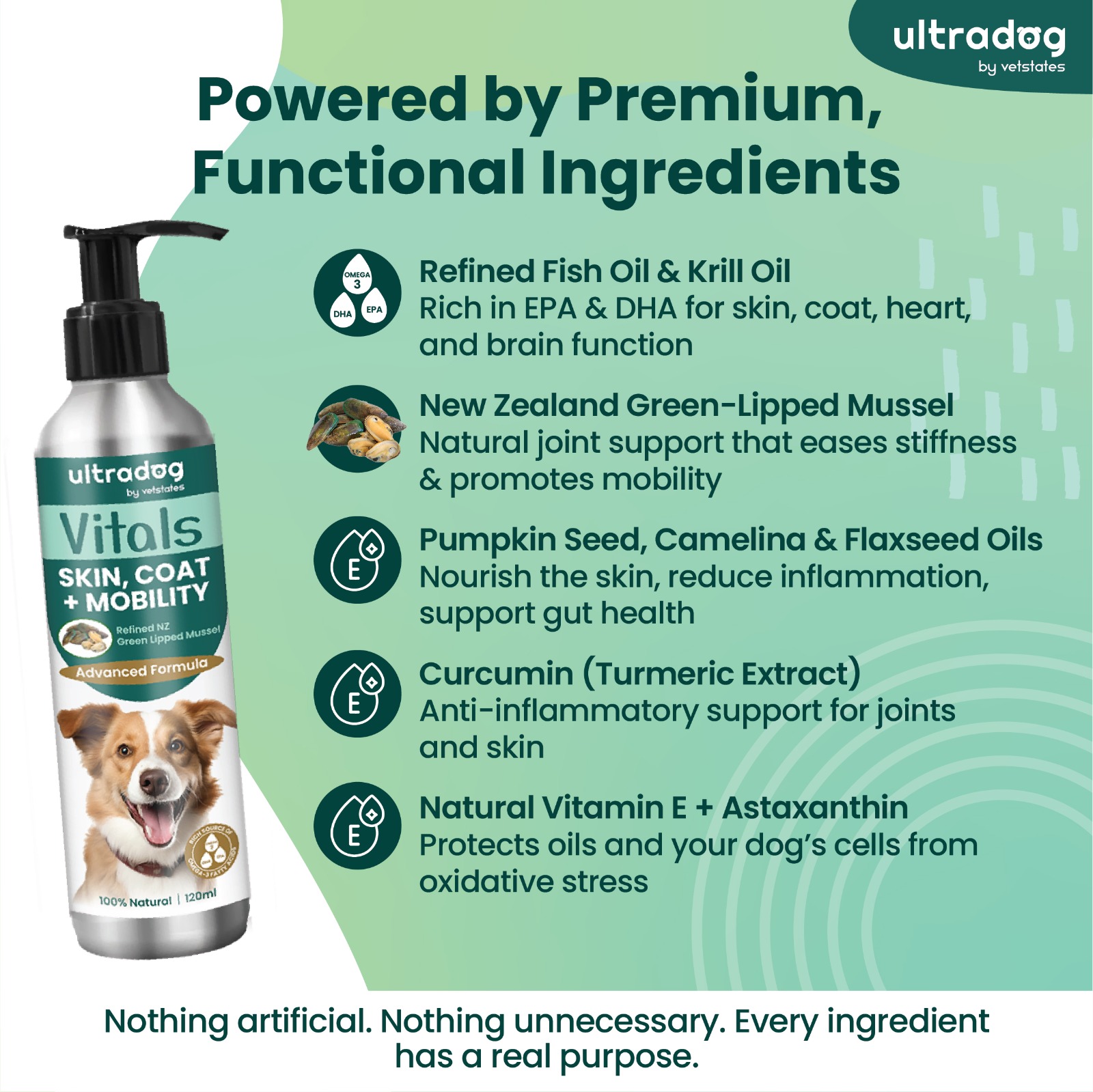UltraDog Skin, Coat + Mobility is more than just a fish oil — it’s a multi-functional wellness oil combining high-quality omega-3s, joint-supporting mussel extract, and anti-inflammatory botanicals to deliver real results you can see and feel.